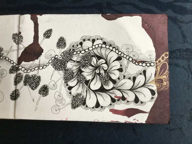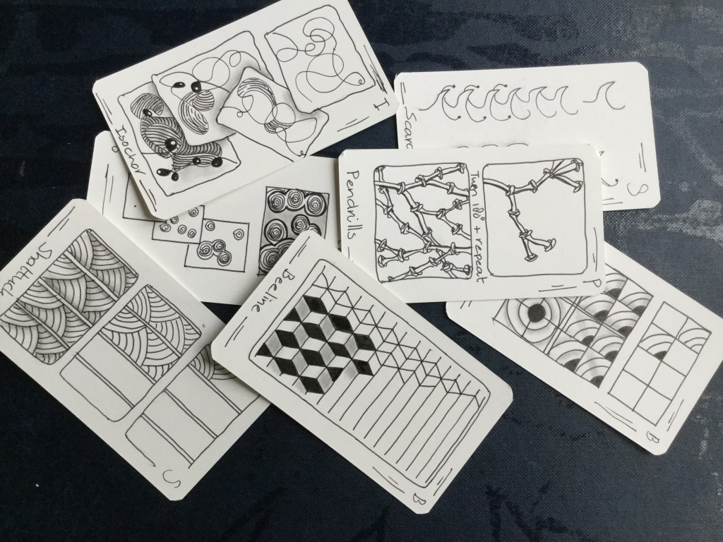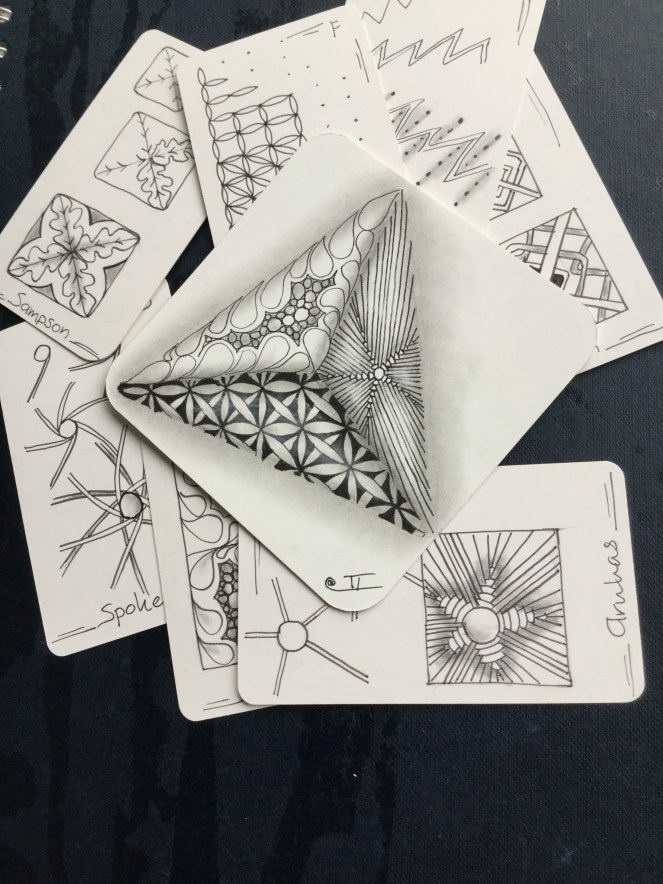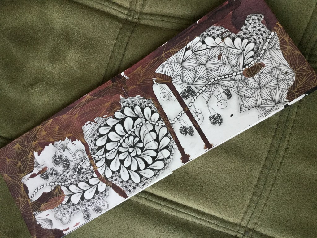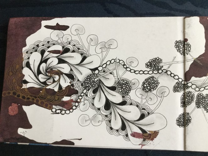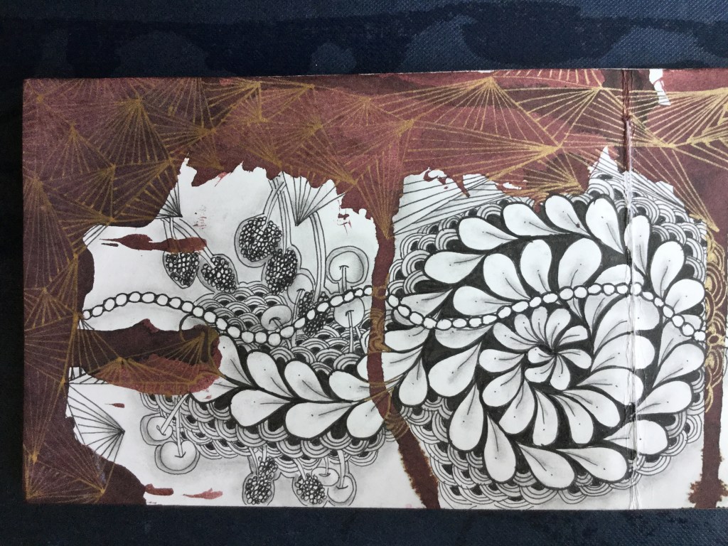 Het is al te lang geleden dat ik geschreven heb! Ondanks dat het Project Pack 06 nog niet af is, is er een prachtig project tussendoor gekomen: Inktobertangles 2019, hierbij teken je elke dag. Dit is een internationaal project, dat steeds groter wordt. Stephanie Jennifer is een CZT in Singapore die de opdrachten vertaald in tangles en dit publiceert als Inktobertangles. Hierbij teken je 1 tangle per dag. Ik heb besloten om eerst een boekje te maken, waarin de inktobertangels gebundeld blijven. De kaft is van karton, bekleed met stof; de inhoud is A4 papier in de lengte gesneden en gebonden; samengevoegd tot mijn Inktobertangles journal! Op de eerste twee pagina’s zie je een explosie aan beweging; daarna wordt het beter, ik beloof het!