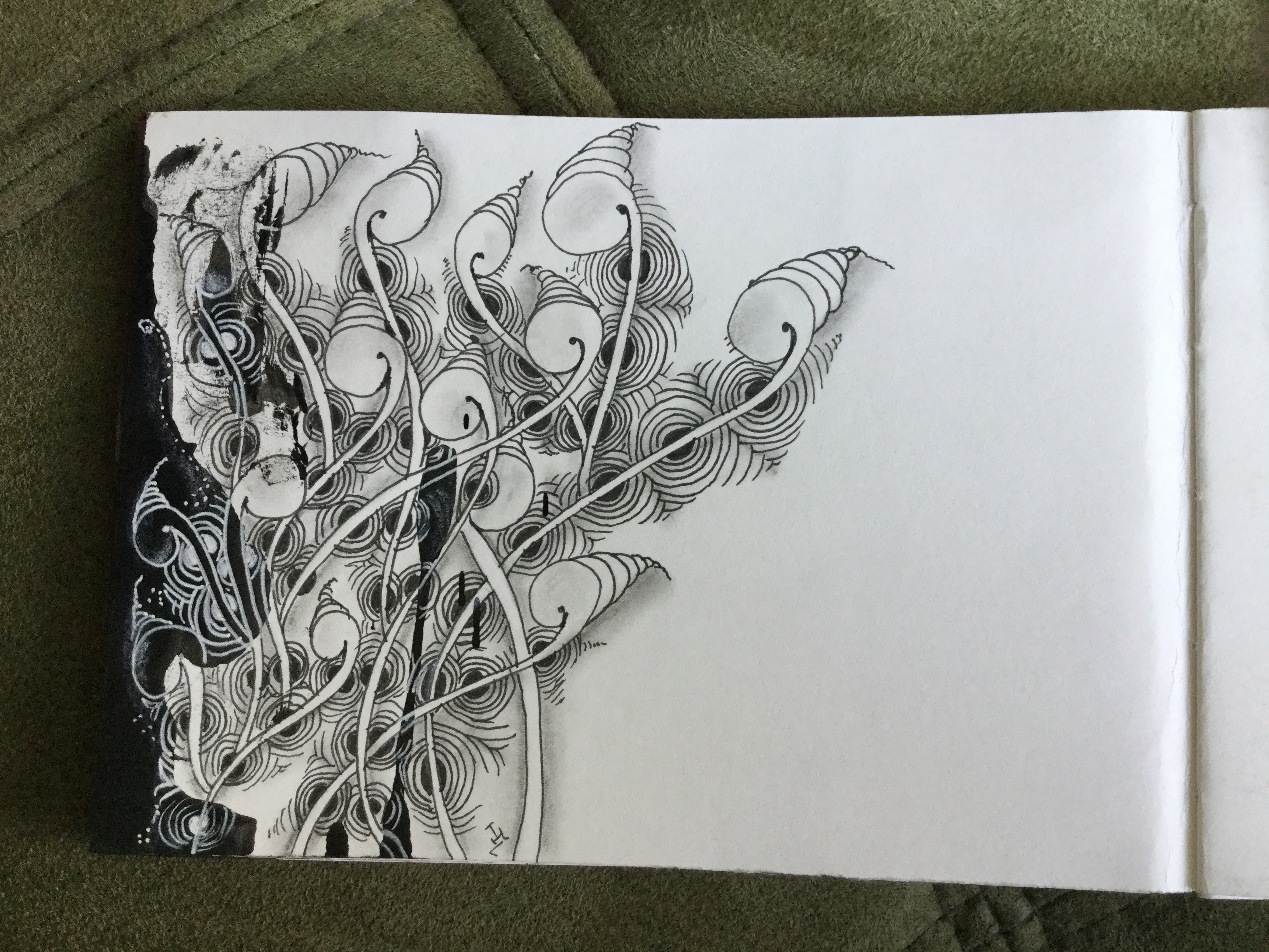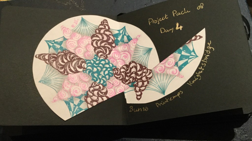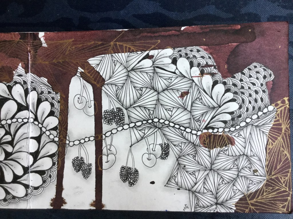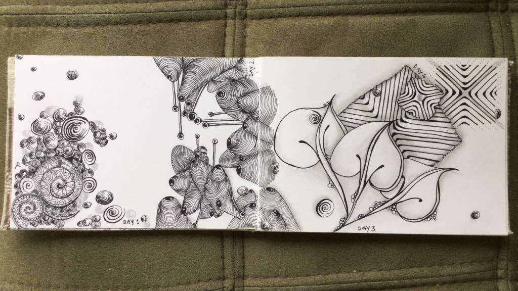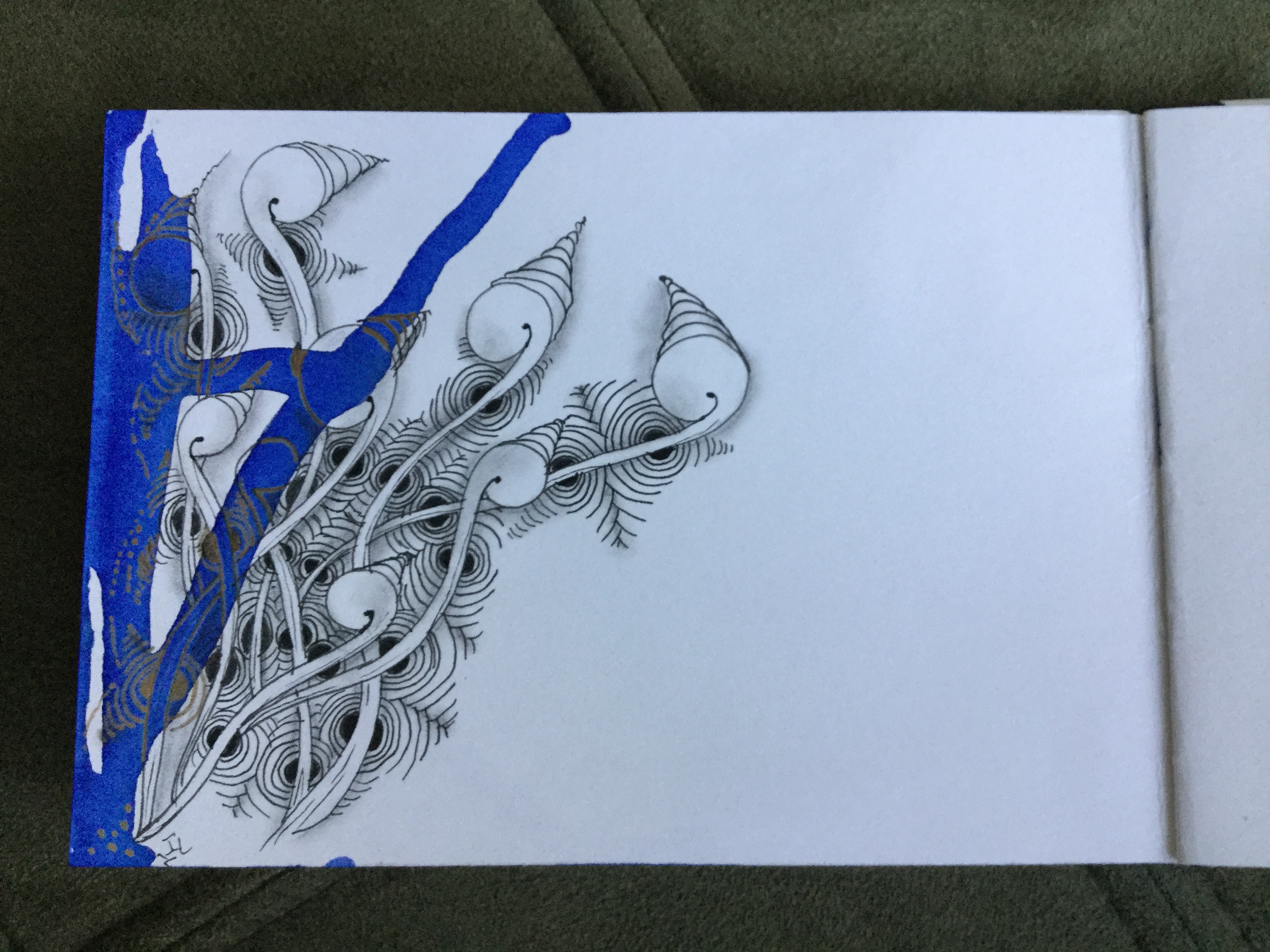 Het is al te lang geleden dat ik geschreven heb! Ondanks dat het Project Pack 06 nog niet af is, is er een prachtig project tussendoor gekomen: Inktobertangles 2019, hierbij teken je elke dag. Dit is een internationaal project, dat steeds groter wordt. Stephanie Jennifer is een CZT in Singapore die de opdrachten vertaald in tangles en dit publiceert als Inktobertangles. Hierbij teken je 1 tangle per dag. Ik heb besloten om eerst een boekje te maken, waarin de inktobertangels gebundeld blijven. De kaft is van karton, bekleed met stof; de inhoud is A4 papier in de lengte gesneden en gebonden; samengevoegd tot mijn Inktobertangles journal! Op de eerste twee pagina’s zie je een explosie aan beweging; daarna wordt het beter, ik beloof het!