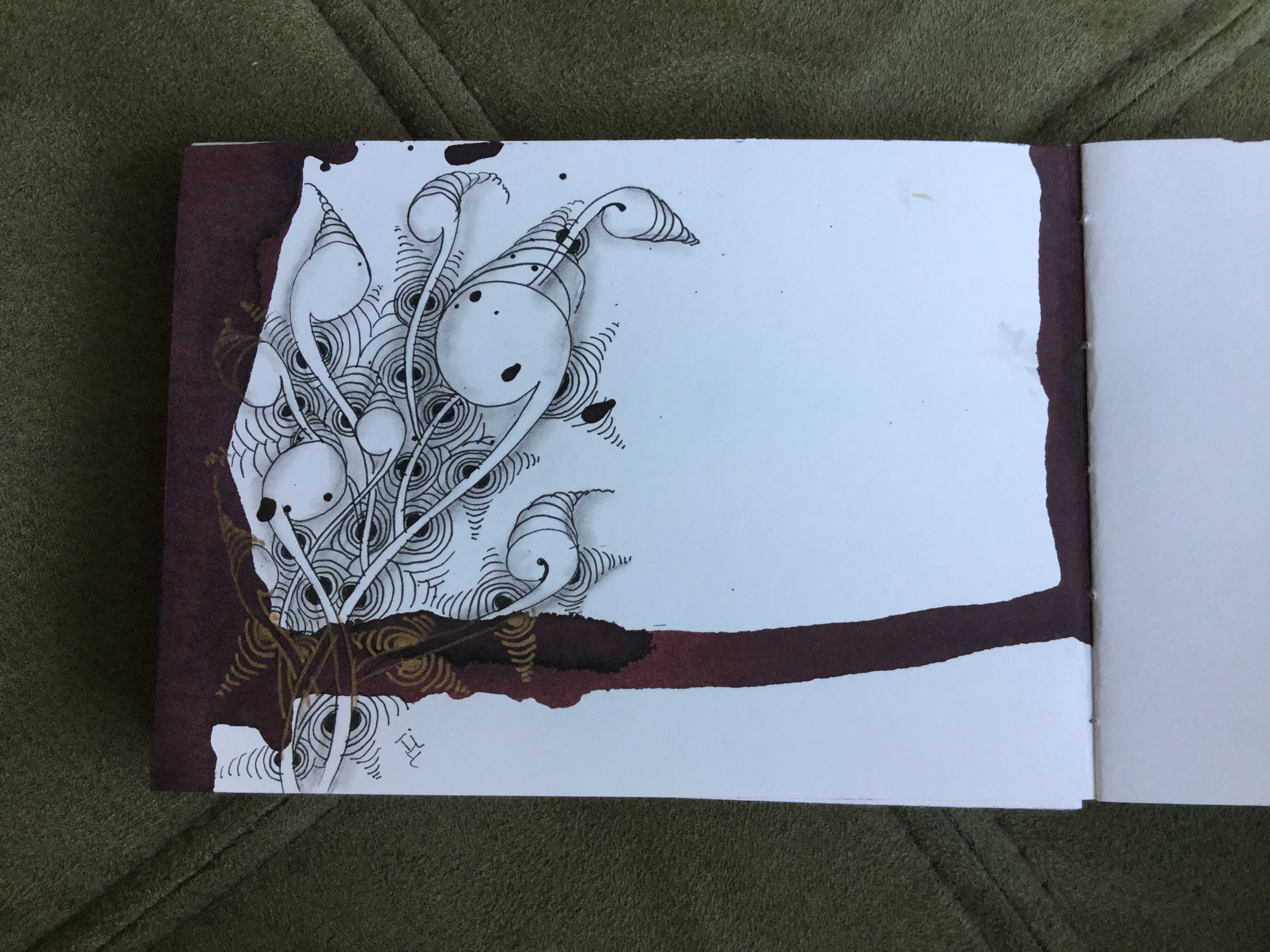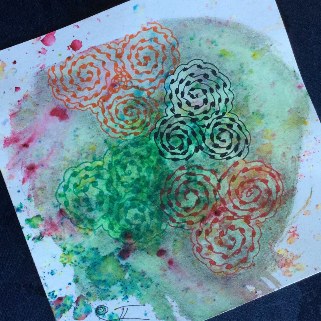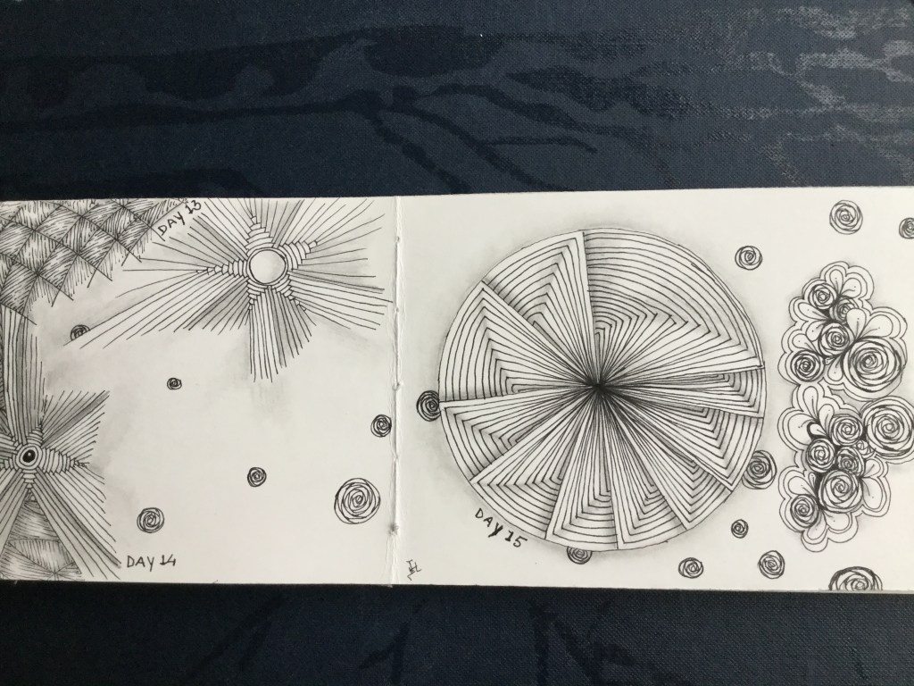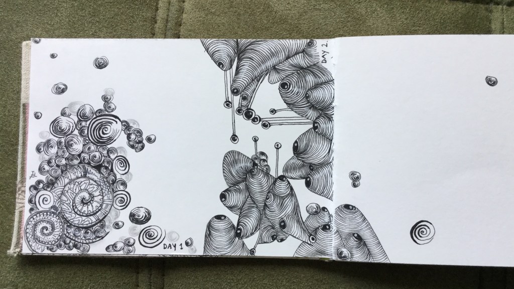Ik begin met het bekijken van de video, waarin de stappen getoond worden en een uitleg gegeven. Dan start ik met de pagina’s met de zwarte vlek, net als in de video en teken alleen wat voorgedaan is. Versie 2 volgt hierna met de pagina’s met de blauwe inktvlek; hierop wordt de basis getekend met een uitbreiding, 1 tangle uit de voorgaande dag wordt eraan toegevoegd. Versie 3 is op de bruine inktvlek, waarbij voorgaande getekend wordt en nog 1 tangle extra; dit geeft een explosie aan tangles!