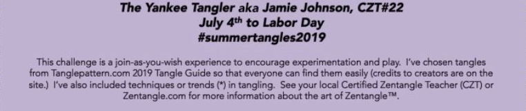 Jamie Johnson heeft een ‘opdracht’ vanaf 4 juli t/m 2 september 2019 opgesteld: voor elke dag is een tangle bepaald, je kiest uiteraard zelf je tempo. Niets moet! Ik heb soms last van een ‘teken-block’ en ben dan meer aan het zoeken wat ik wil tekenen dan aan het tekenen. Opdracht-groepen vind ik heerlijk om te volgen; er komt altijd wel iets moois uit en geeft weer inspiratie. Dus: Thank you Jamie for your challenge!