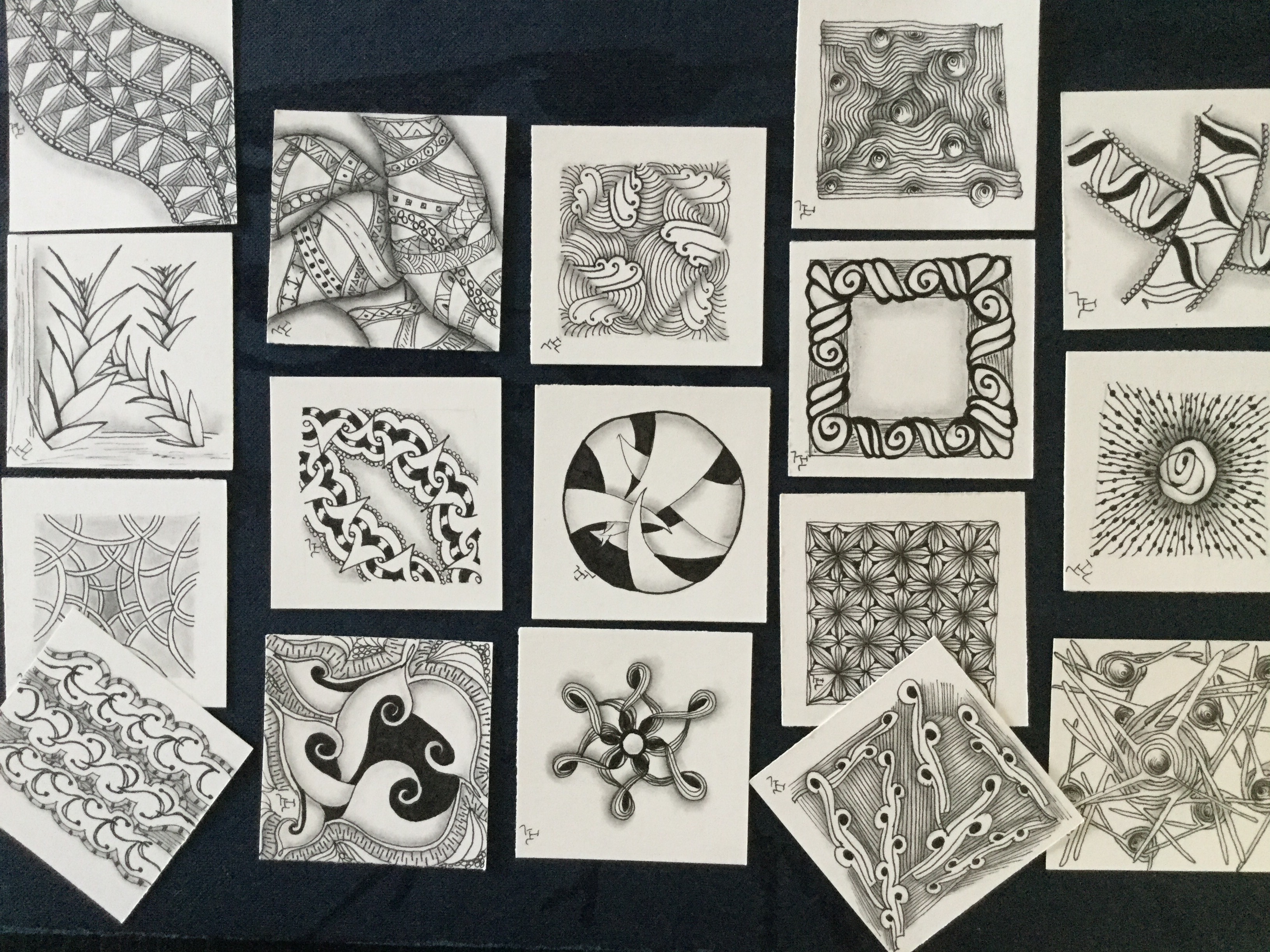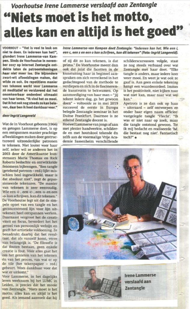 Eenieder zoekt naar kansen om rust te vinden in deze hectische tijd; ik vind dit in Zentangle en wereldwijd zijn er velen met mij. Het afgelopen jaar ben ik gestart met wekelijkse live uitzendingen op Instagram, ik noem het ‘workshop’ met de focus op ‘samen tekenen’; ik start met een tile en motiveer mijn mede-tanglers om alle creatieve ruimte te nemen die in hen opkomt. Voor mijn gevoel zijn het chaotische momenten, ik hoor gelukkig anders terug. Het is grappig om te horen hoe verschillend dit beleefd wordt, maar dit is nou net zo mooi. Bij en in Zentangle is een van de motto’s: No mistakes, only opportunities. En daar gaat het om, zie de mogelijkheden, onderzoek deze en geniet ervan!