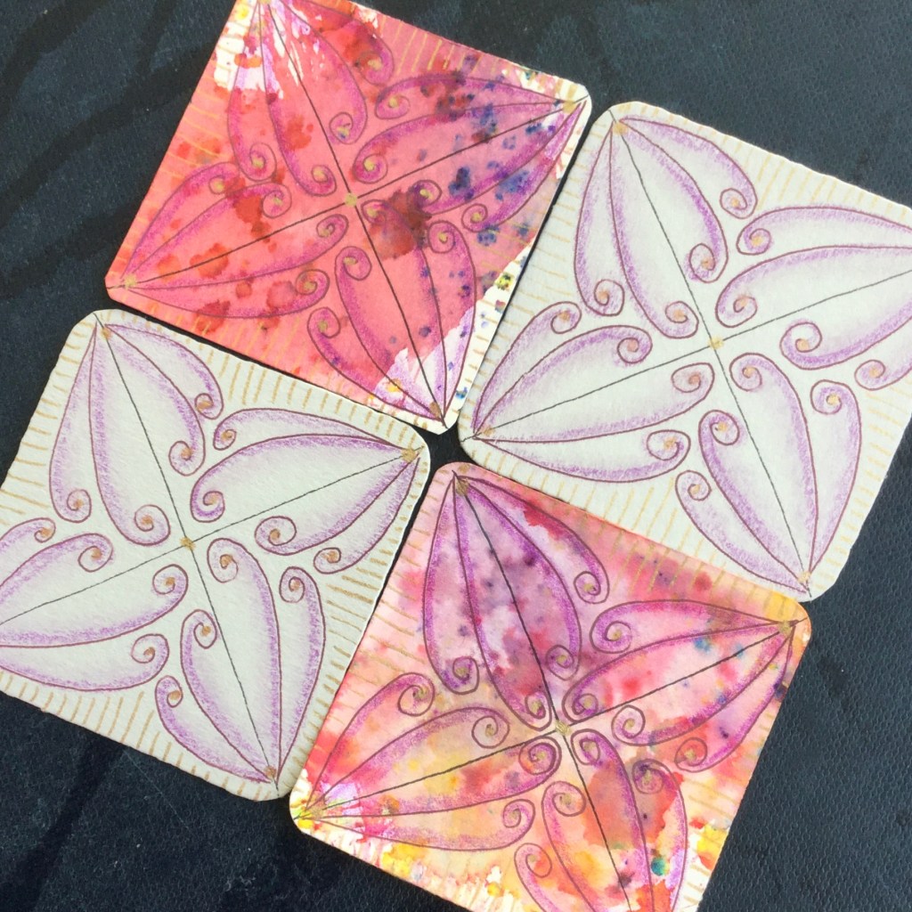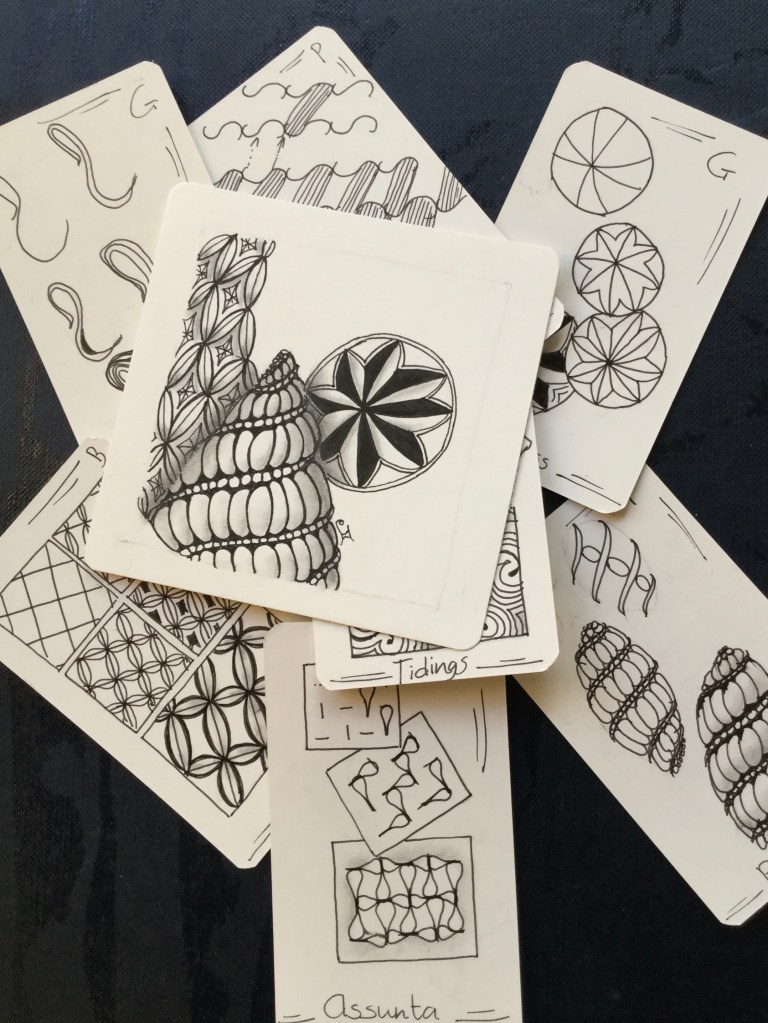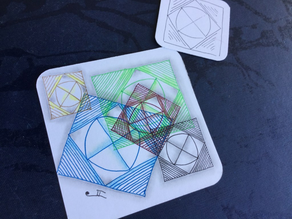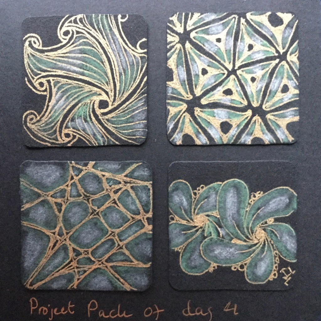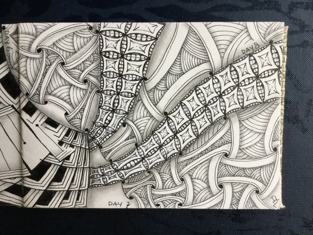 Dag 6 was op bijou-tiles; dit is een klein formaat en vierkant. Er werden 4 bijou’s aan elkaar geplakt (uiteraard aan de achterkant), waarna een patroon is getekend. Als je dit hierna losmaakt en de tiles draait, krijg je weer een heel ander effect. Zo leuk!