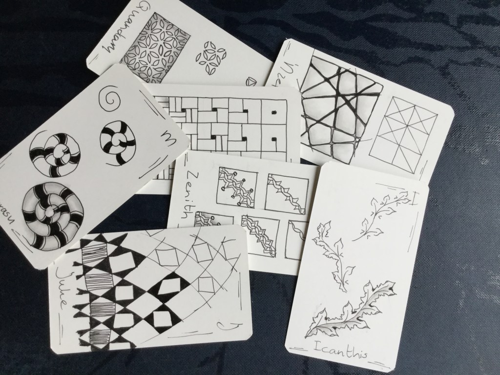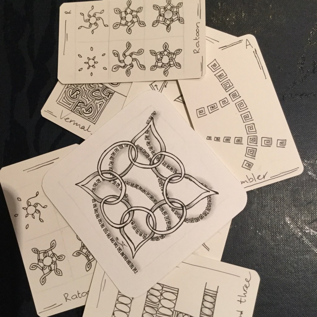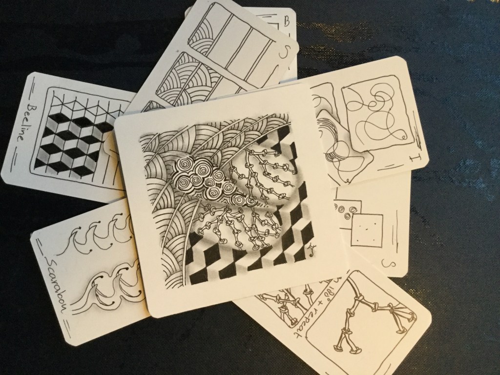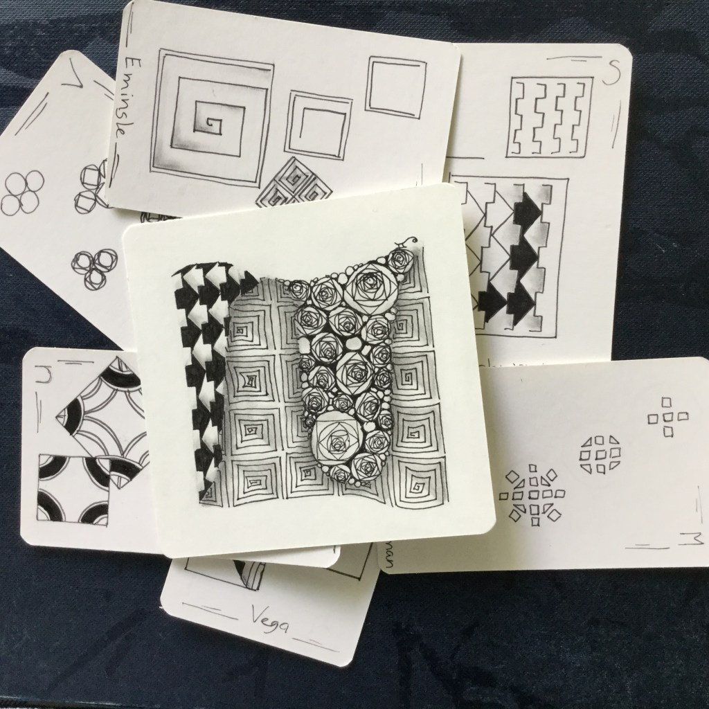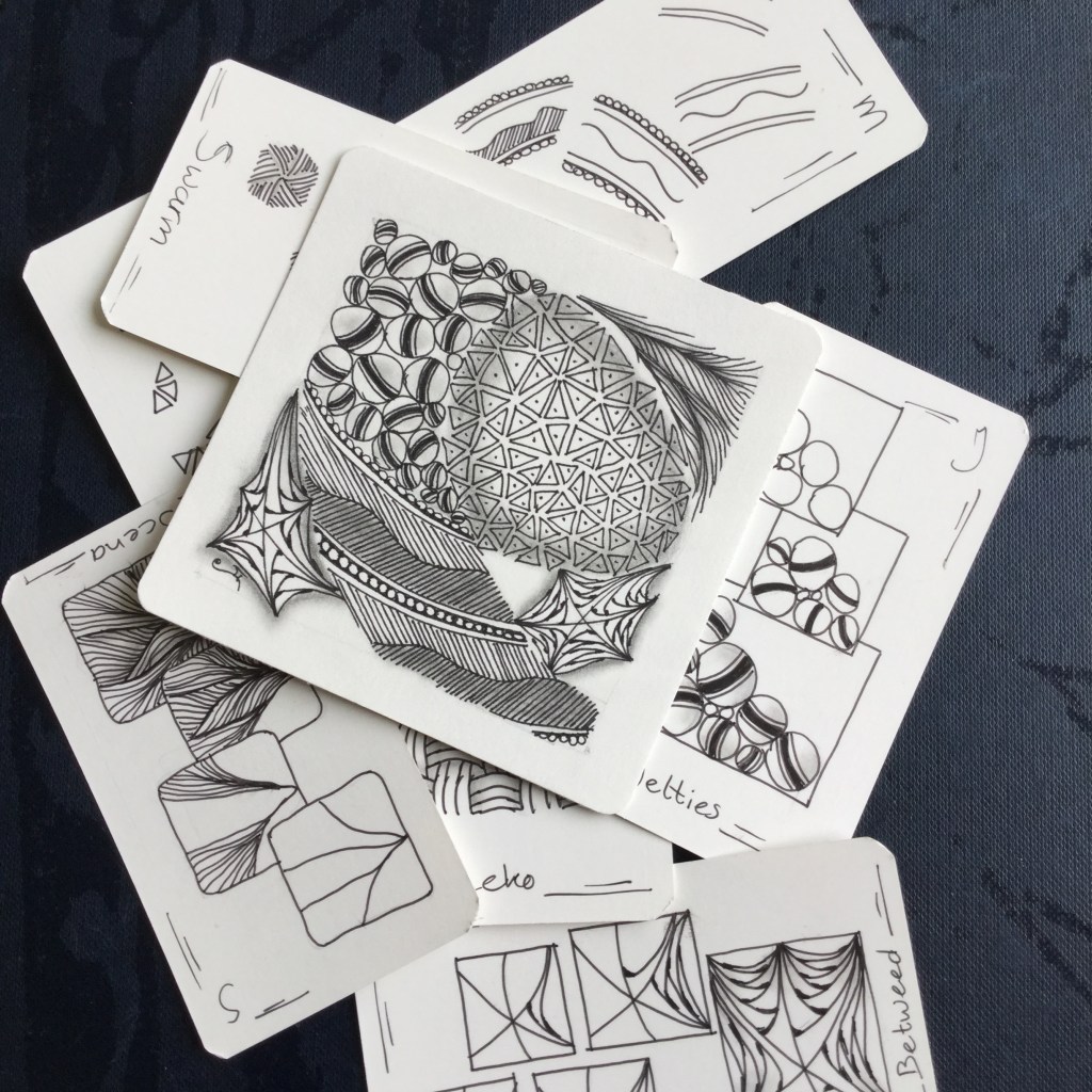 Dag 6 was op bijou-tiles; dit is een klein formaat en vierkant. Er werden 4 bijou’s aan elkaar geplakt (uiteraard aan de achterkant), waarna een patroon is getekend. Als je dit hierna losmaakt en de tiles draait, krijg je weer een heel ander effect. Zo leuk!