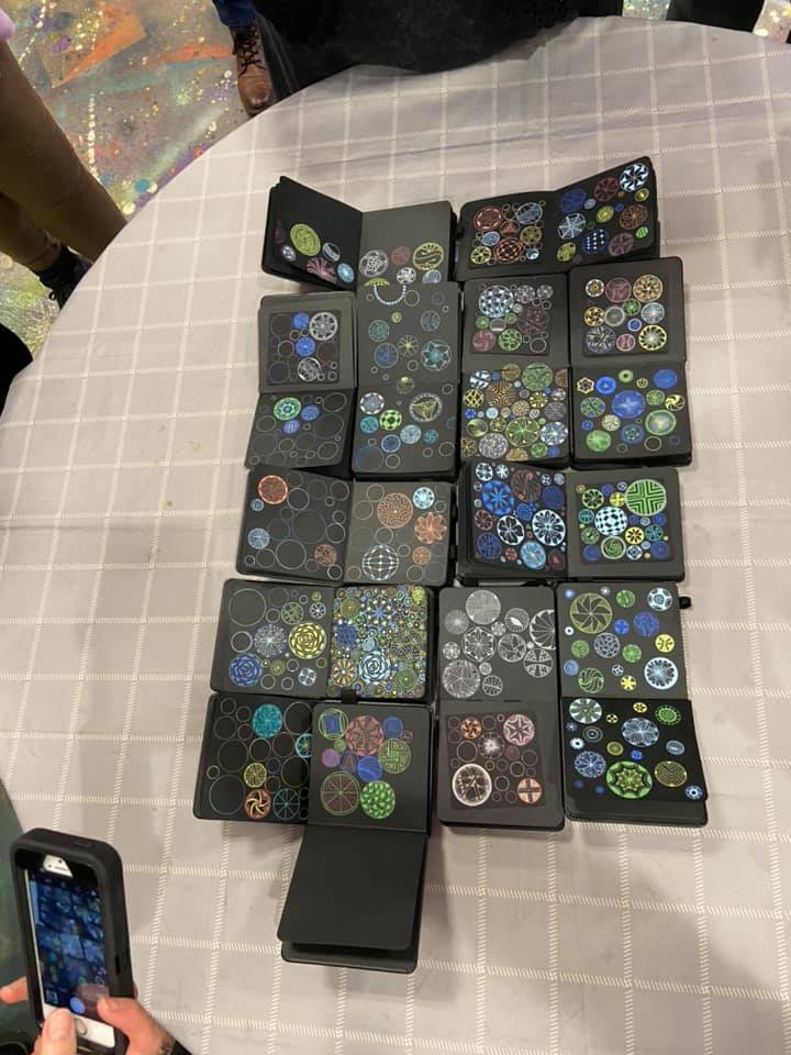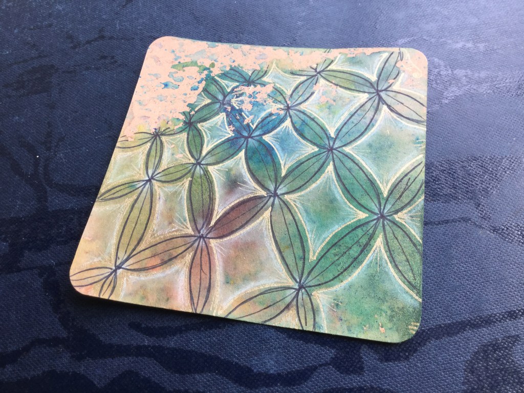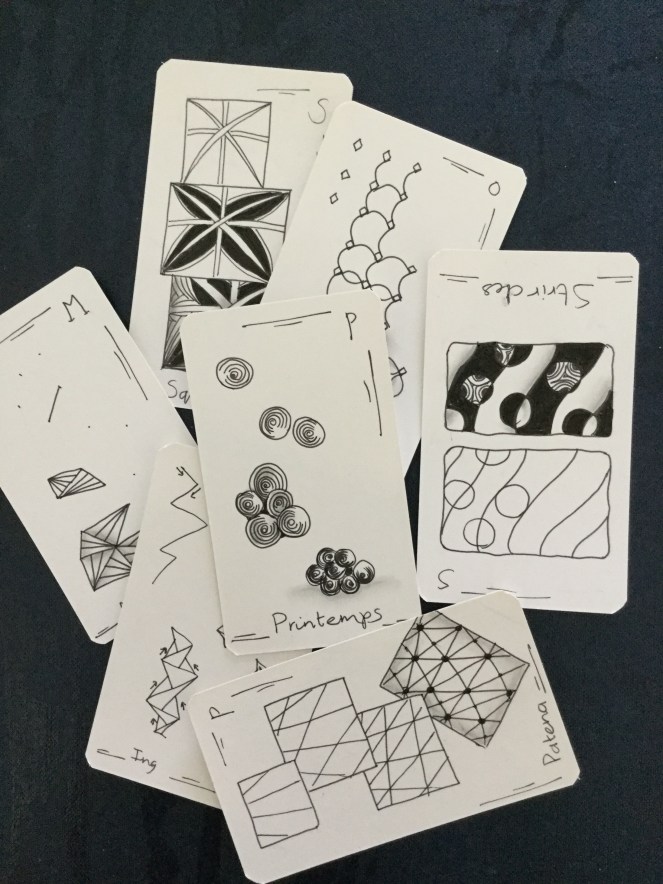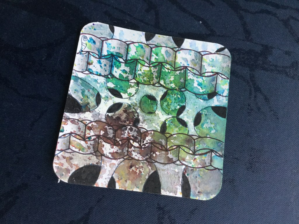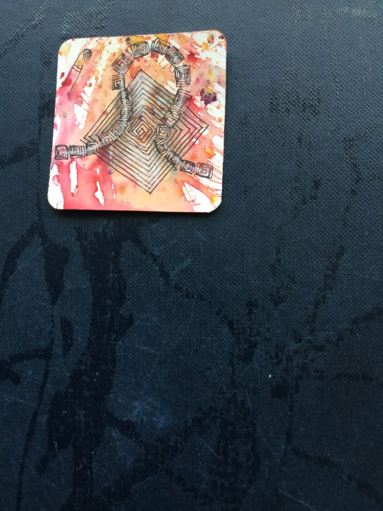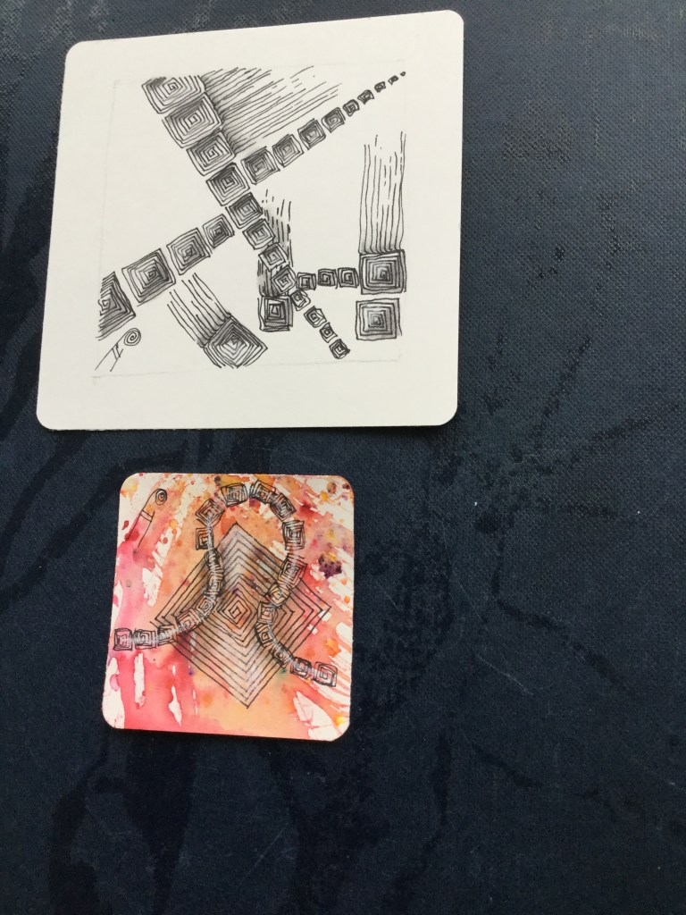 Dag 6 was op bijou-tiles; dit is een klein formaat en vierkant. Er werden 4 bijou’s aan elkaar geplakt (uiteraard aan de achterkant), waarna een patroon is getekend. Als je dit hierna losmaakt en de tiles draait, krijg je weer een heel ander effect. Zo leuk!