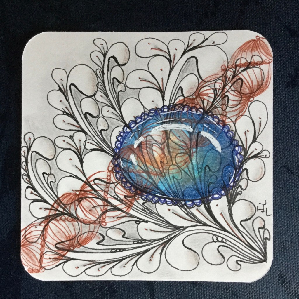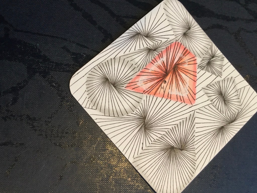 Een aantal maanden verder was mijn nieuwsgierigheid aangewakkerd naar de achterliggende gedachte; tijd voor een workshop. De CZT-er waar ik terecht kwam blijkt een oud-schoolgenoot te zijn, helemaal leuk en de workshop heeft zoveel nieuwe inspiratie gegeven, heerlijk. Dit was mijn eerste tile die ik tijdens deze workshop gemaakt heb: