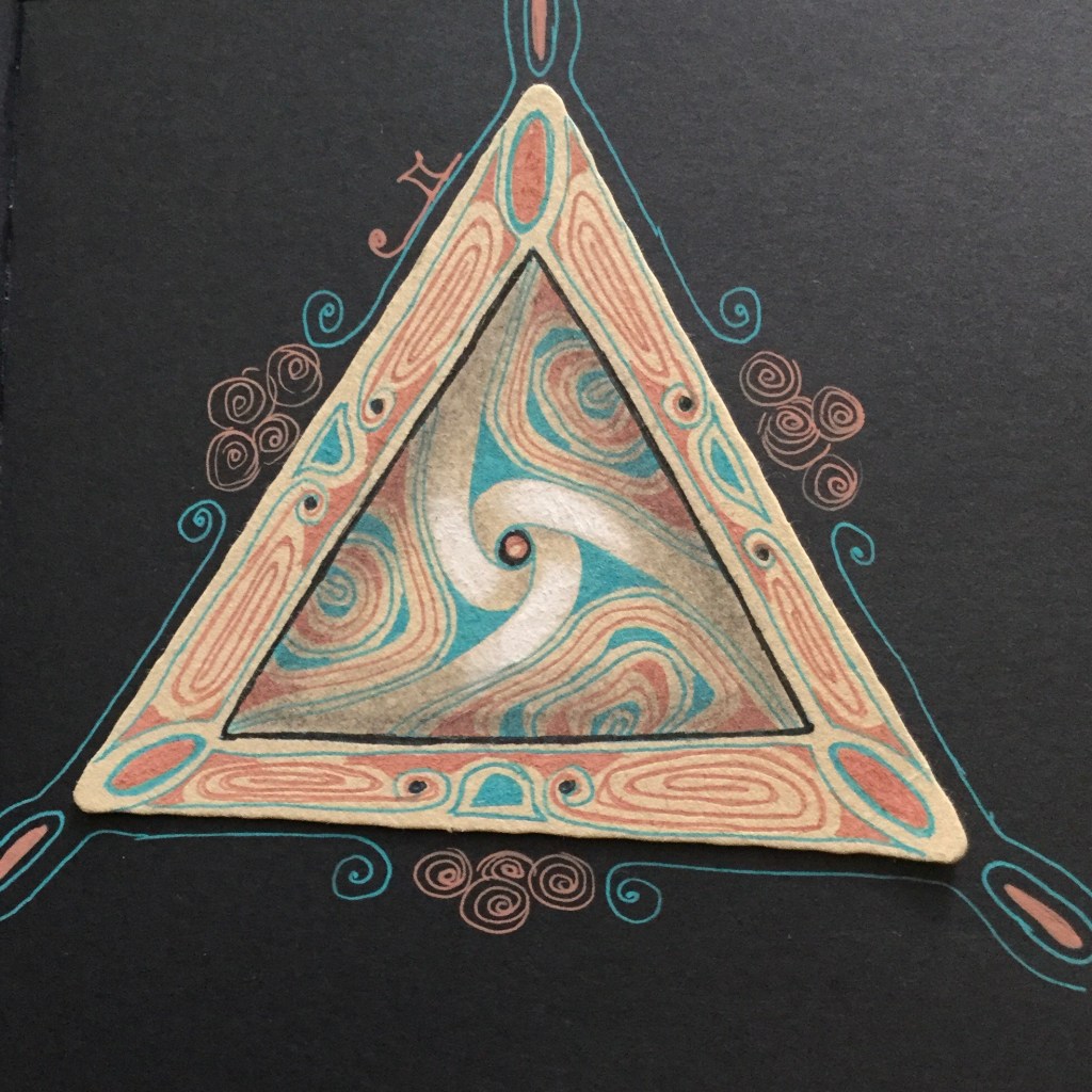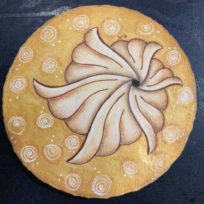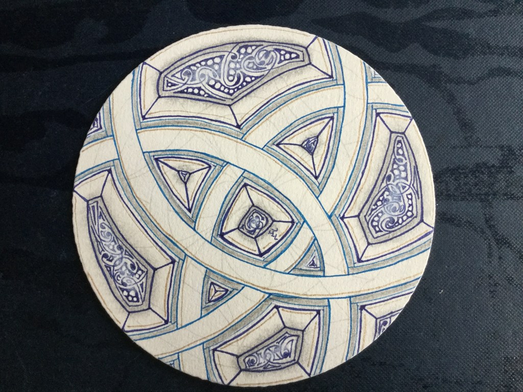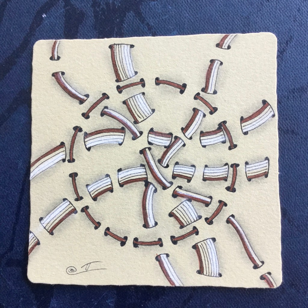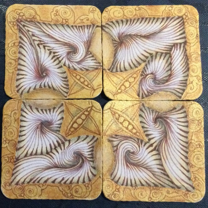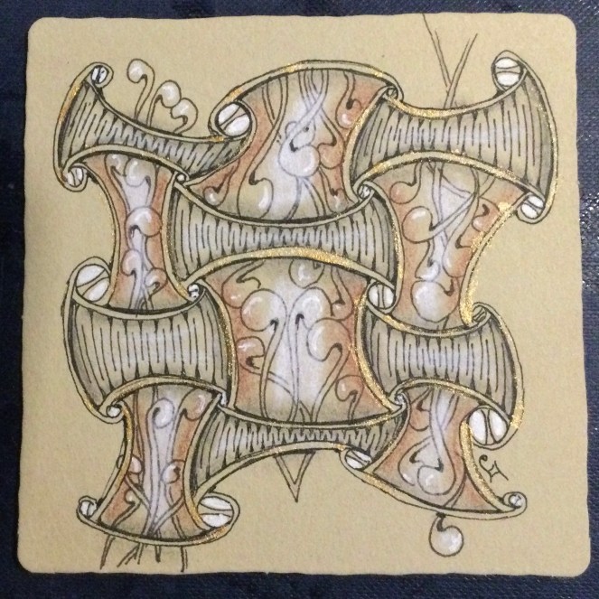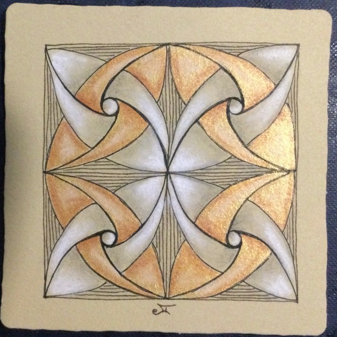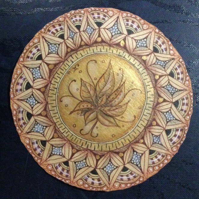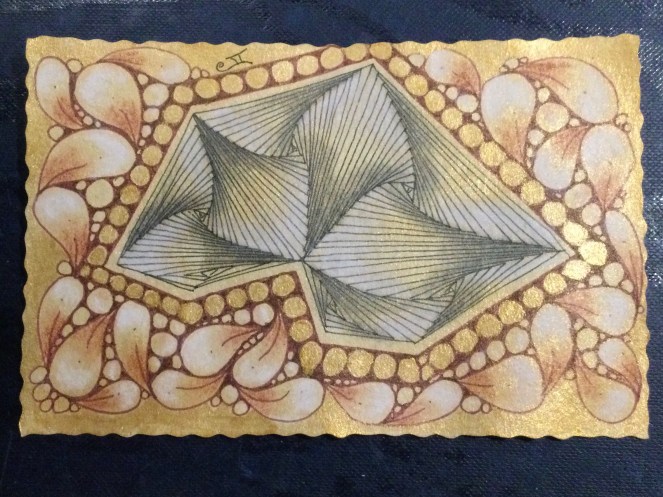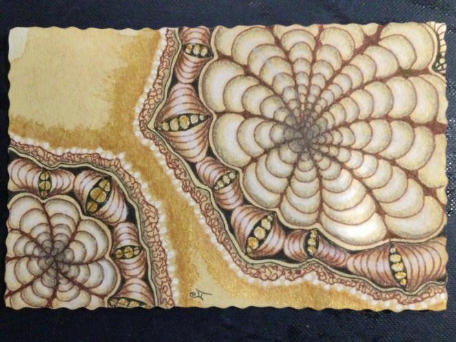 Grappig detail: ik had niet alle benodigdheden in renaissance kleuren; dus ik heb een paar Zendala’s (rond) en een Phi tile (rechthoekig) zelf gekleurd met…….. koffie! Genoeg geschreven; hieronder de resultaten: dag 1 was op een renaissance Zendala (denk aan de koffie….), met een ‘nieuwe’ tangle: Bronx Spear (een uitgerekte Bronx cheer)