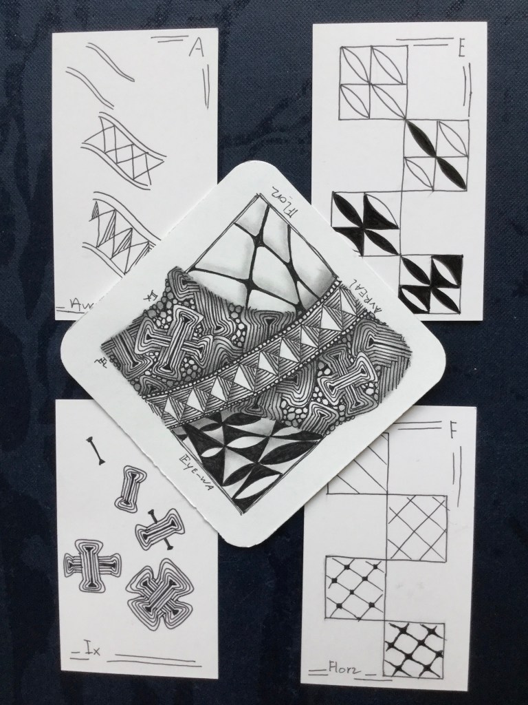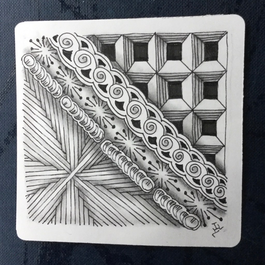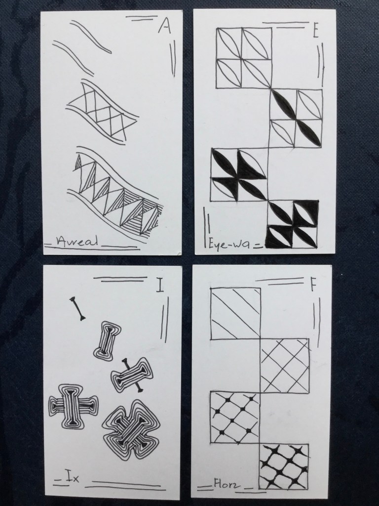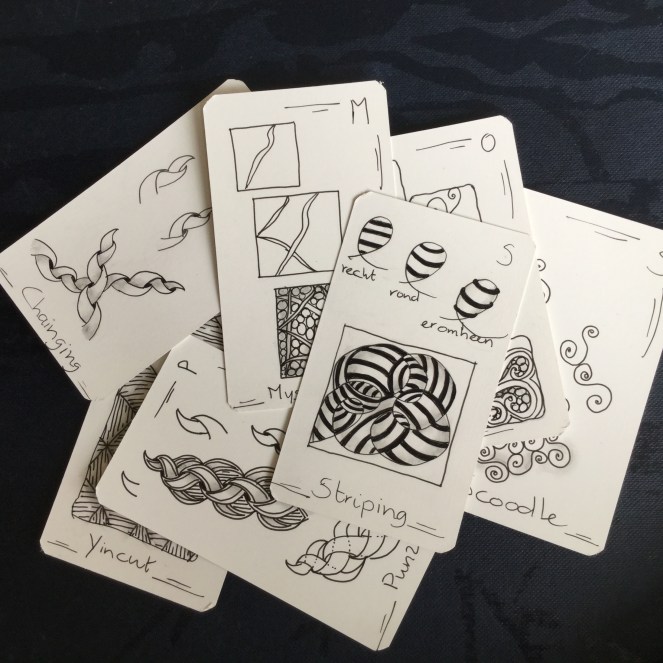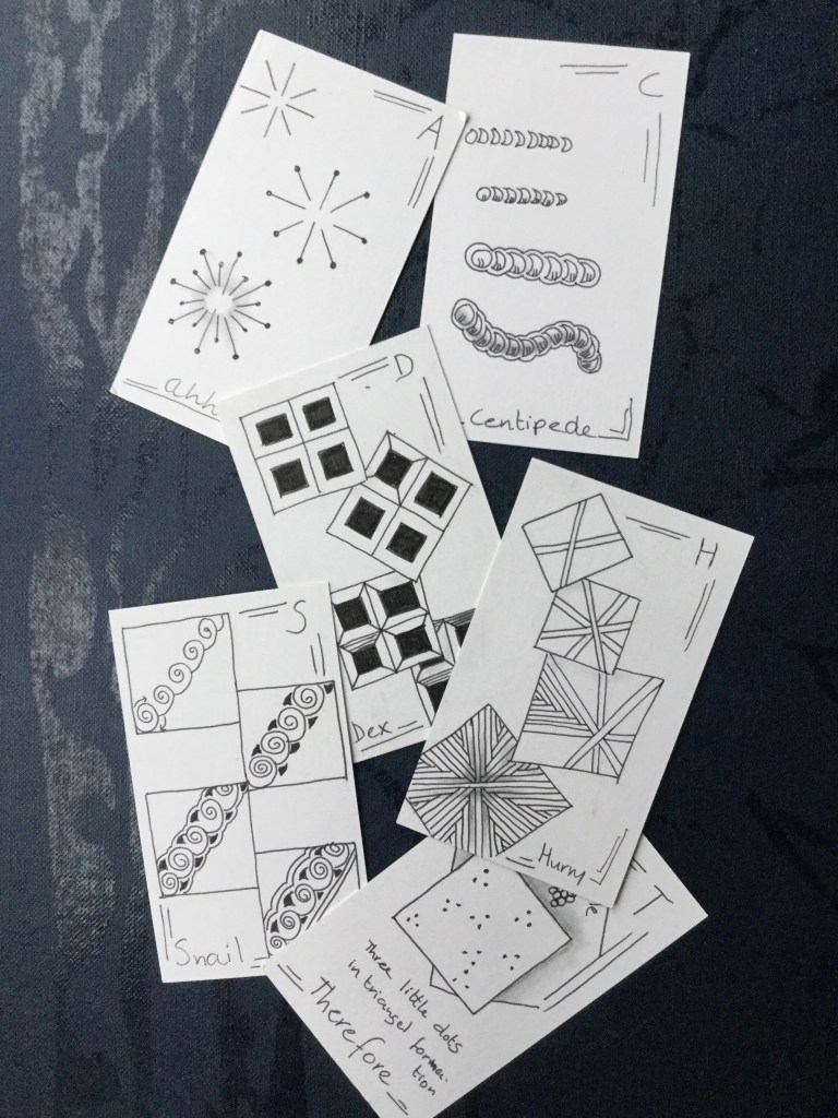 Maar ja, elke week tangles kiezen is soms best lastig, dus: een thema bedacht. Dit werd: alfabet serie. Elke week tekenen we een tile met tangles die beginnen met een letter van het alfabet.