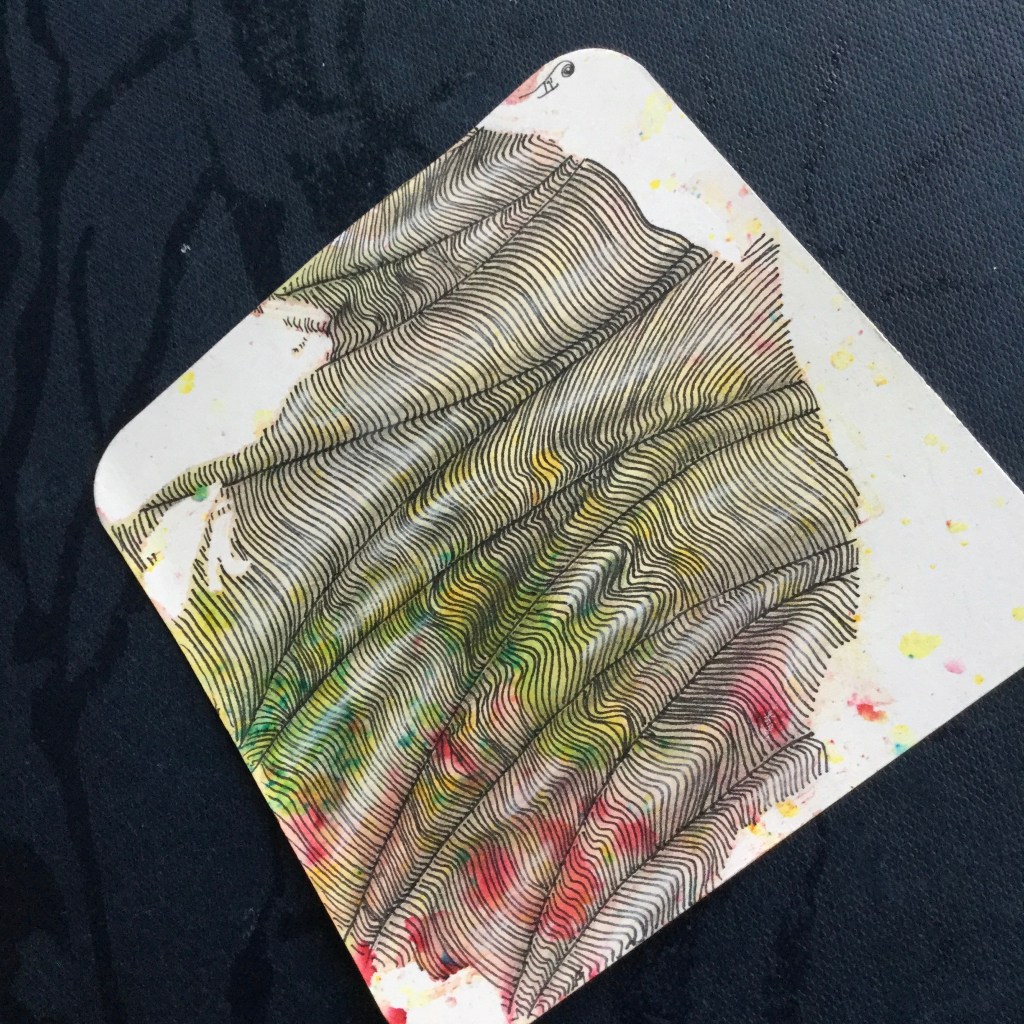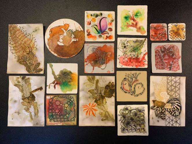 Daarnaast was er eco-dyed papier (door mij), waarop getangled kon worden en waren er markers, penselen, potloden en ‘gewone’ microns waar we mee aan de slag gingen. Wederom met prachtige resultaten!