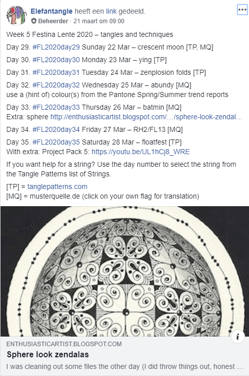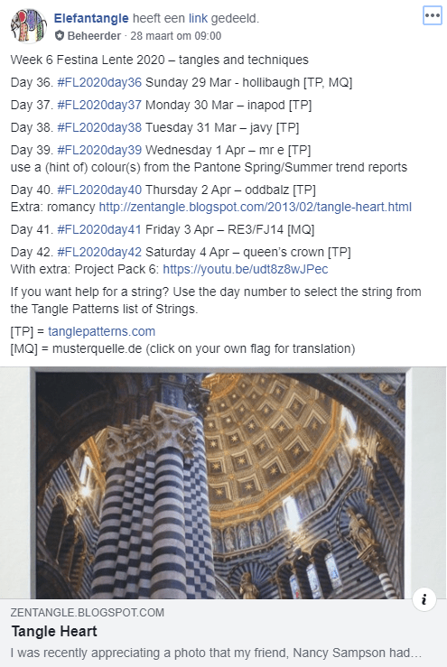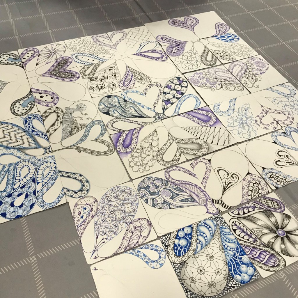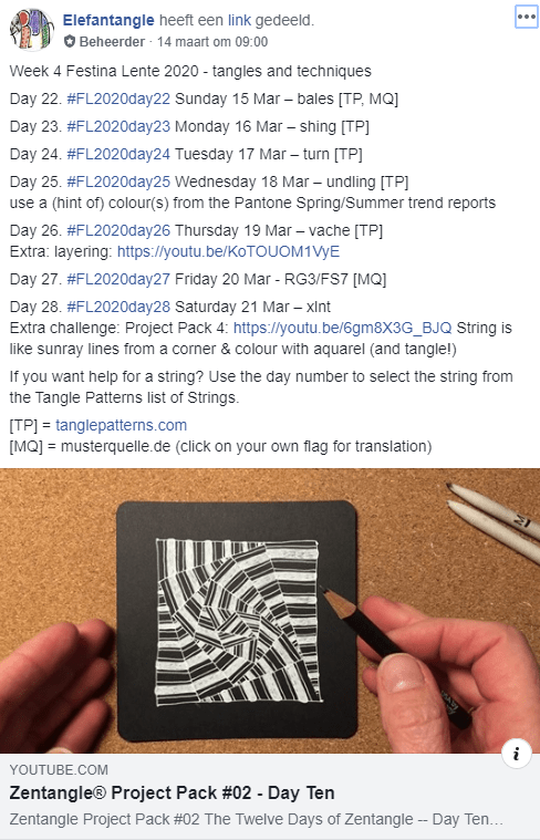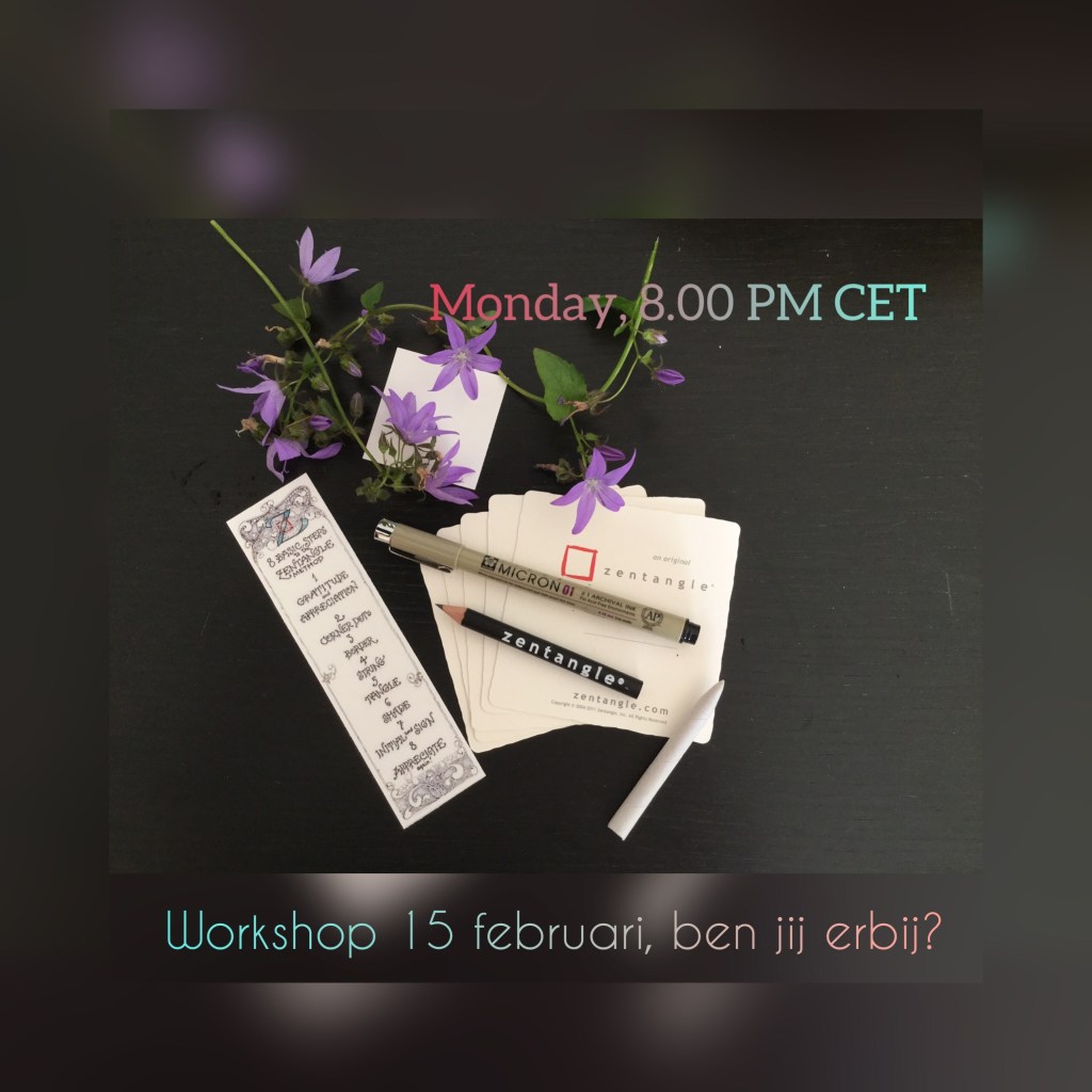 In 2020 heeft onze Nederlands Zentangle-clubje een ontzettend leuke les gehad van Anoeska Waardenburg, die het waard is om te verspreiden. Maar ja, het is niet mijn creatie. Dus ik heb aan Anoeska gevraagd of zij akkoord was dat ik dit instuurde en hoera, hoera; het was goed. Tot mijn verbazing en grote vreugde ben ik hiervoor uitgekozen, naast Shannon Flynn uit Amerika en Yvonne Rein uit Australie. Whoop whoop. Ik ben vereerd, vind het bijzonder spannend maar vooral ontzettend enthousiast en blij dat ik een les mag verzorgen. Voor 40-50 Zentanglers. OMG, ik heb nog nooit zo’n grote groep les gegeven. Spannend, leuk, zin in! De voorbereidingen zijn in volle gang bezig, ik ga deze les een aantal keer inplannen om het tot op het bot te beheersen en dat ik ga GENIETEN! Ja, je leest het goed; in hoofdletters. Wat is overigens ook al deed voordat ik wist dat ik een gastinstructeur werd.