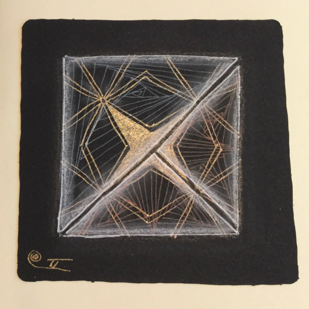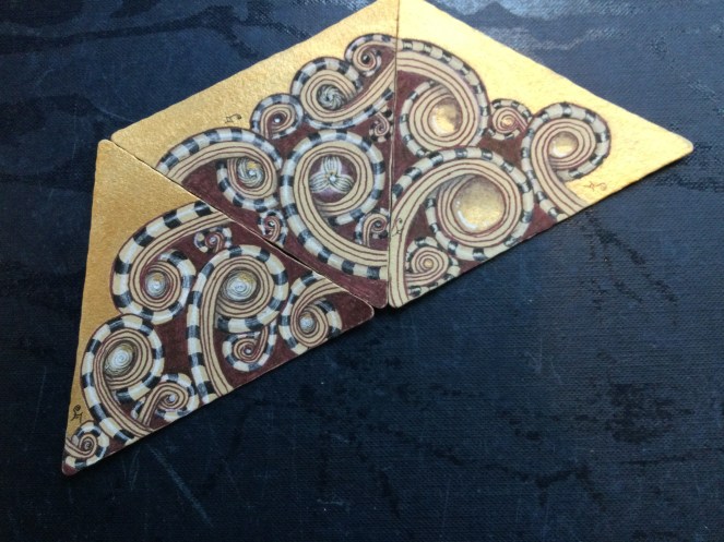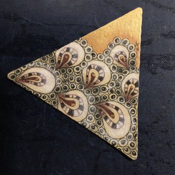 Elk jaar in december komt ‘HQ’ (headquarter, het hoofdkantoor) van Zentangle met de 12 dagen van Zentangle, om de vakantie te vieren. Elk project omvat een thema, dit keer was het thema Renaissance. Er werd getekend op Renaissance tiles, deze zijn lichtbruin gekleurd en de kleuren bruin, zwart en wit geven prachtige effecten. Dit jaar is dit aangevuld met goud gouache (ik heb met goudverf gewerkt, zoals de meesten die met eigen materialen werken).