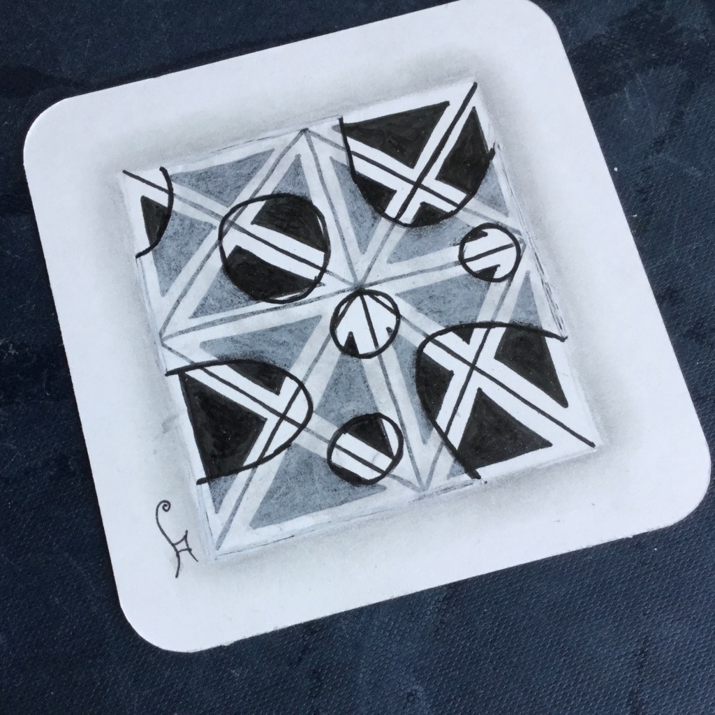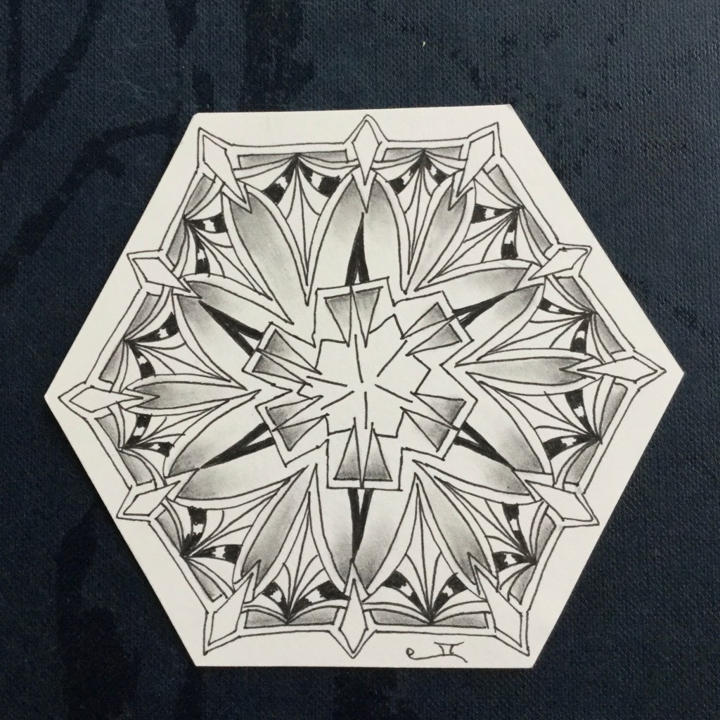 En hier is dan dag 7; dit is de nieuwste tangle van 2019: Hollis. Ik vind deze tangle iets te strak en wordt eigenlijk pas mooi als er iets bij of achter getekend wordt. Deze had wat mij betreft nog wat uitbundiger gemogen. Dit is getekend op een grijze Hexagon tile (van Marguerite Samama, CZT) met zwart PN en een witte gelpen, verder is geschaduwd met zwart, wit en blauw.