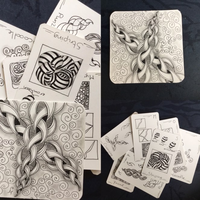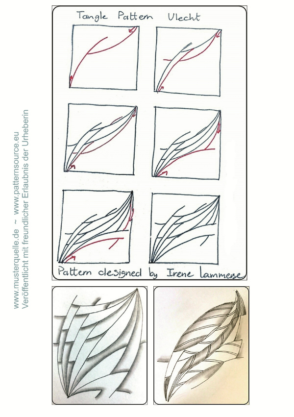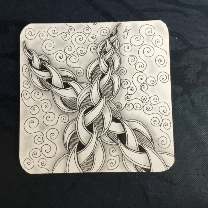 In februari 2017, nog voordat ik Certified Zentangle Teacher was, was ik aan het tekenen en bleek spelenderwijs een nieuwe tangle te hebben ontworpen. Nu bestaan er al zoveel tangles, dat dat nog maar bewezen moet worden! In Duitsland bestaat een tanglesite, Musterquelle.de, een van de beheerders van deze site is Ela Rieger, waar nieuwe tangles aangeboden kunnen worden. Ela onderzoekt of de tangle al bestaat, of het bijvoorbeeld een variatie is op een bestaande tangle, of dat het echt een nieuwe is. Ik had geluk! Hij bestond nog niet; tangle ‘Vlecht’ was ontstaan, jippie!