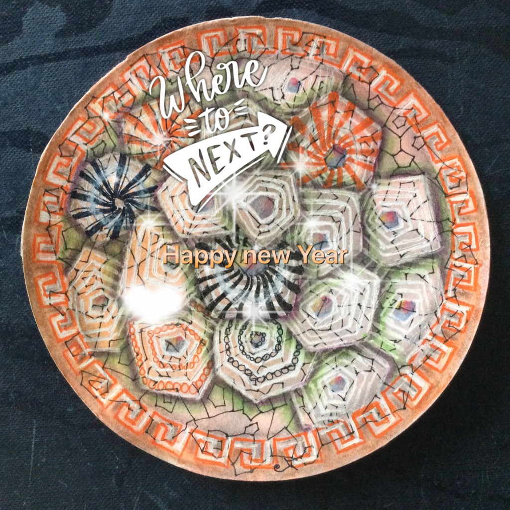 Dag 8 was weer op een Zendala. Degene die de materialen besteld hadden, kregen een voorbedrukte Zendala, dit zie je niet meer als je erop tekent. Op deze tile werd om het centrum heen getekend en na afloop werd aan iedereen gevraagd om het middelste gedeelte naar eigen inzicht in te vullen, ik heb gekozen voor Tintigus. Ook dit geeft weer zo’n leuk effect!