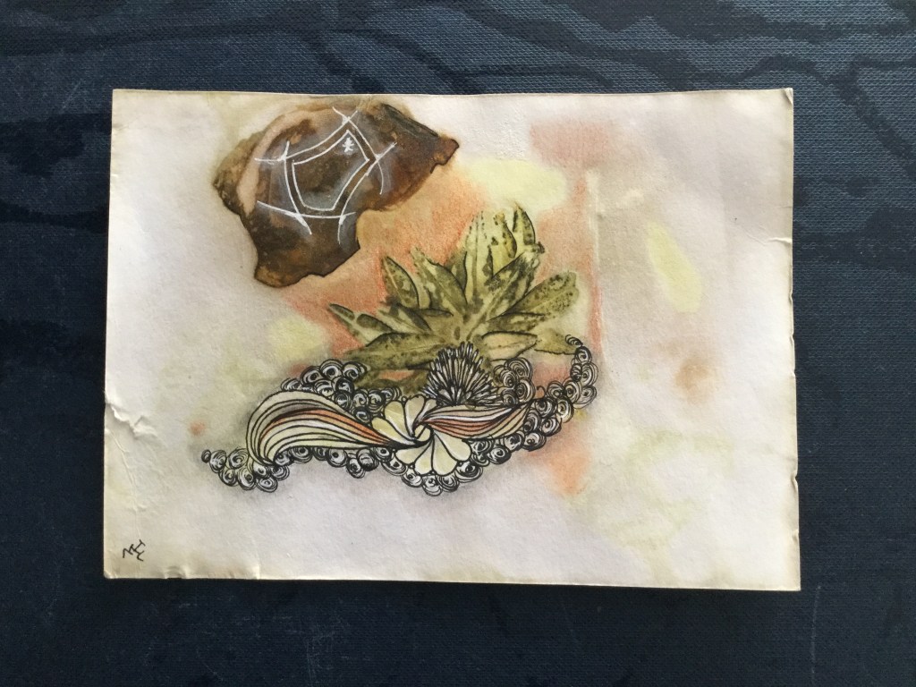 Het is mogelijk om te tangelen op Eco-dyed papier; dit is papier dat op een speciale manier is behandeld waardoor er unieke prints van bladeren op het papier is afgezet. Links een versie zonder tangles, rechts met tangles. De uitdaging hierbij is: wanneer stop je met tekenen……?