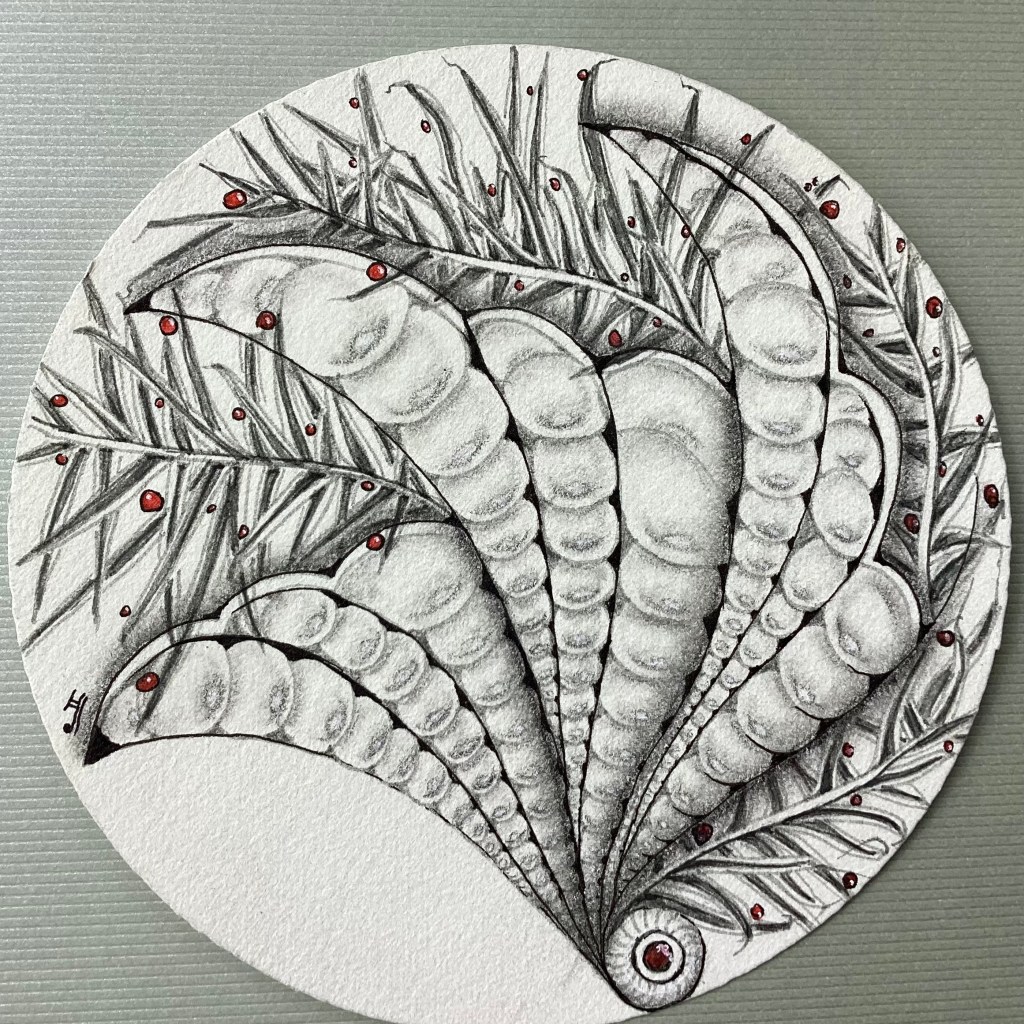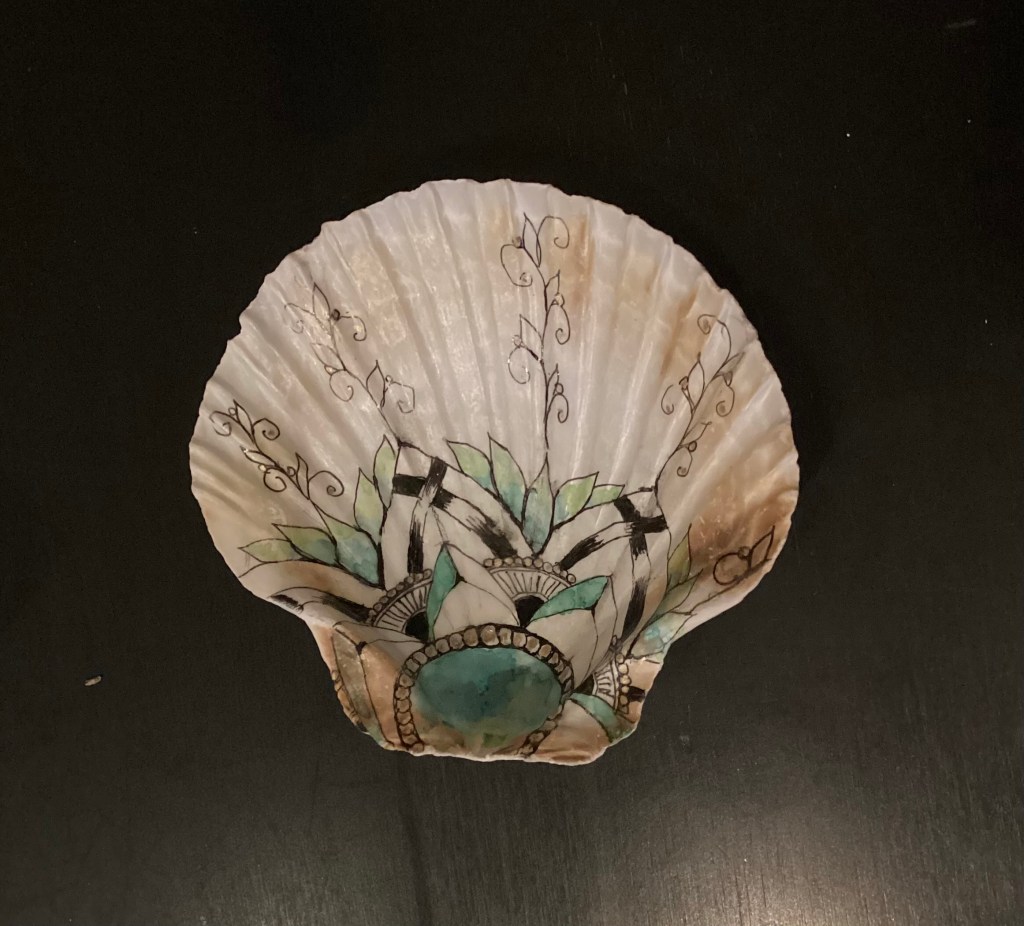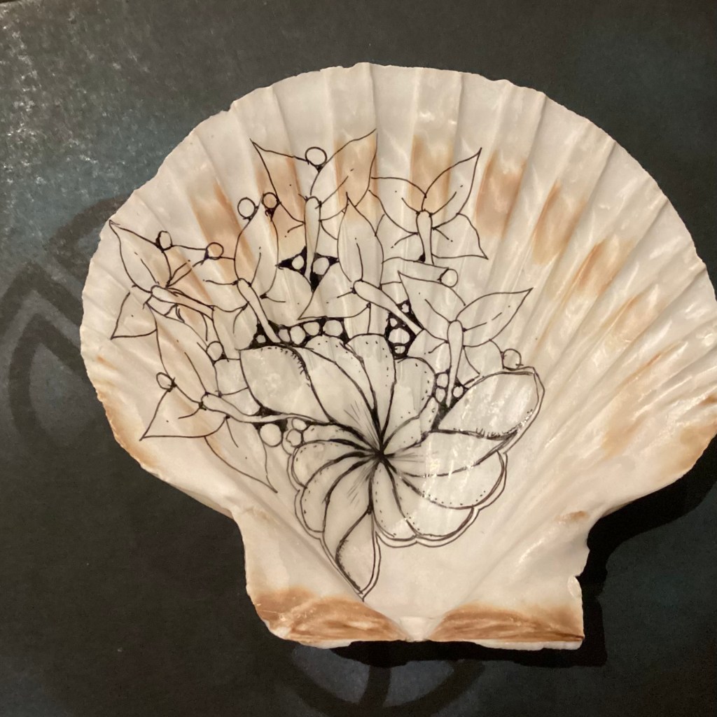 Dit wordt een hele bijzondere ervaring; we gaan tekenen in een Jakobsschelp. Voor deze workshop moet je de basis workshop gedaan hebben en het liefst enige Zentangle tekenervaring hebben. Tekenen in een schelp is echt heel anders dan op papier maar o zo leuk! Hieronder een paar voorbeelden. Deze workshop kost € 35,00